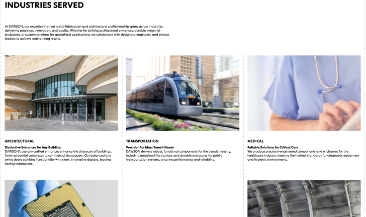 At DAWSON, our expertise in sheet metal fabrication and architectural craftsmanship spans across industries, delivering precision, innovation, and quality. Whether for striking architectural entrances, durable industrial enclosures, or custom solutions for specialized applications, we collaborate with designers, engineers, and project leaders to achieve outstanding results.